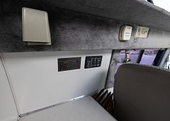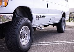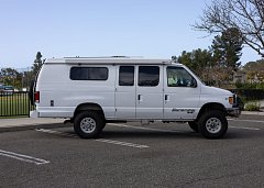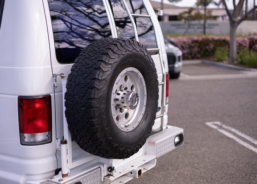 The van is powered by a 1999 Ford E350 V10 long-block engine with a replacement installed at 179k miles (current mileage: 288,175). A 56-gallon combined fuel capacity provides extended range. Additional systems include solar, two AGM batteries, an inverter, shore power connections, fresh and black water tanks, a propane furnace and water heater, and an aftermarket stereo with Apple CarPlay.