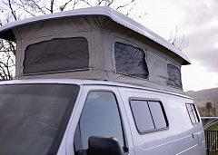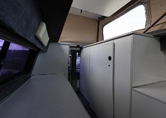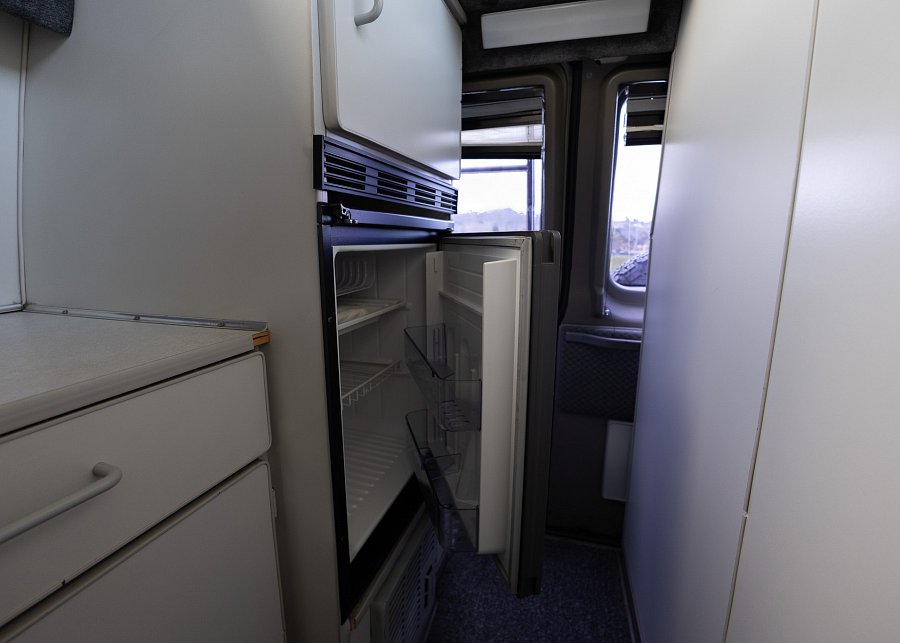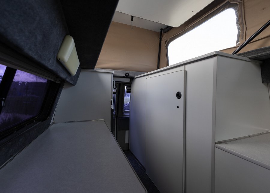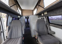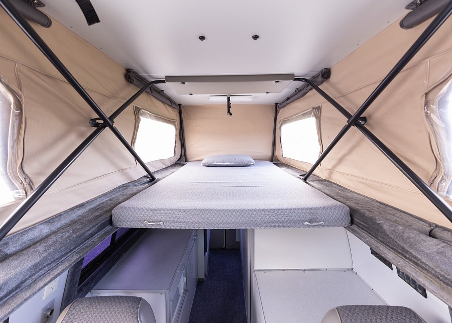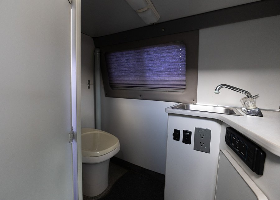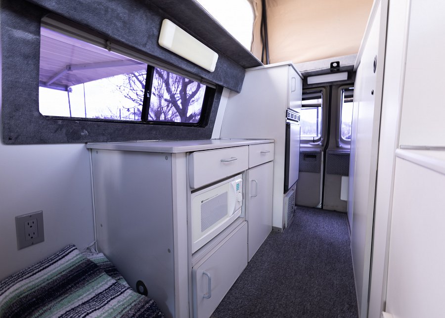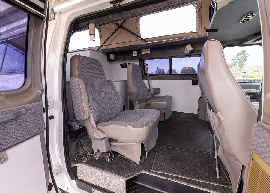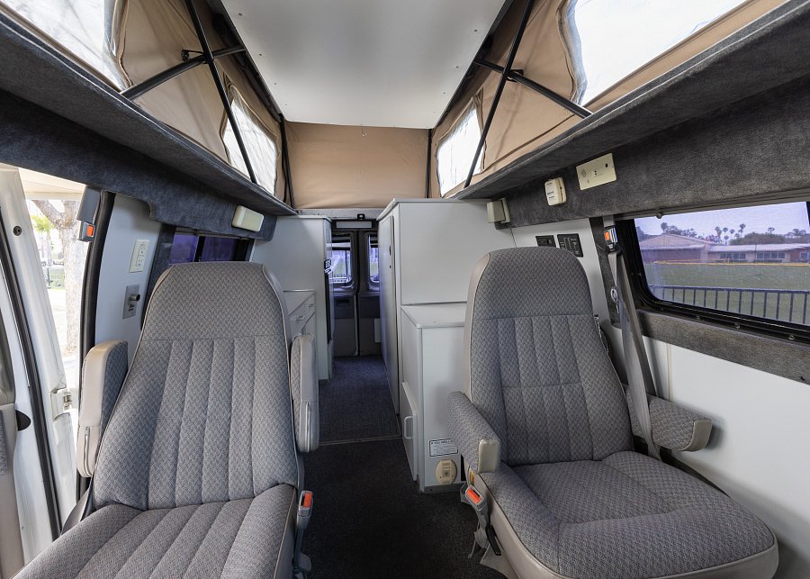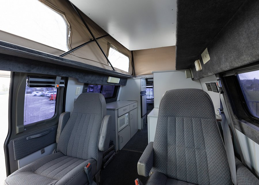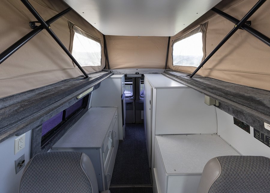 Inside, the pop-top adds headroom and creates a sleeping area. Two rear captain’s chairs make the cabin more comfortable on long drives, and the galley includes a microwave, fridge, countertop space, and storage. The interior also features a bathroom with a toilet and sink, which is a useful addition for extended travel. Window shades, multiple charging areas, and built-in storage round out the living space.