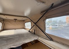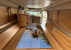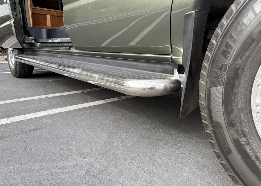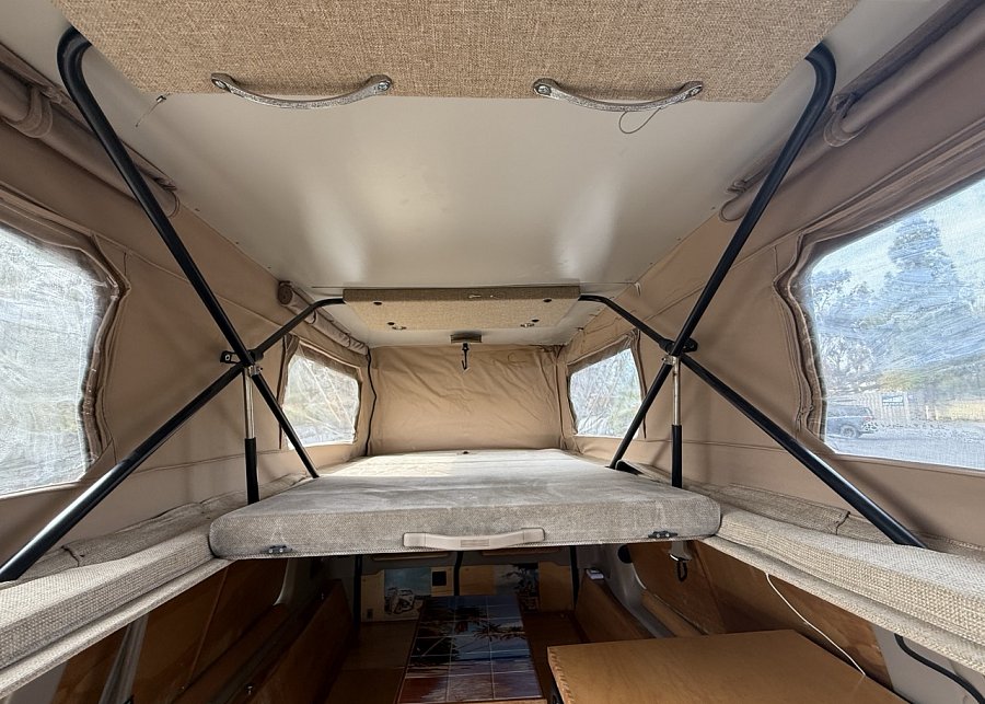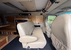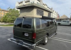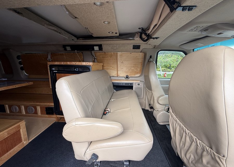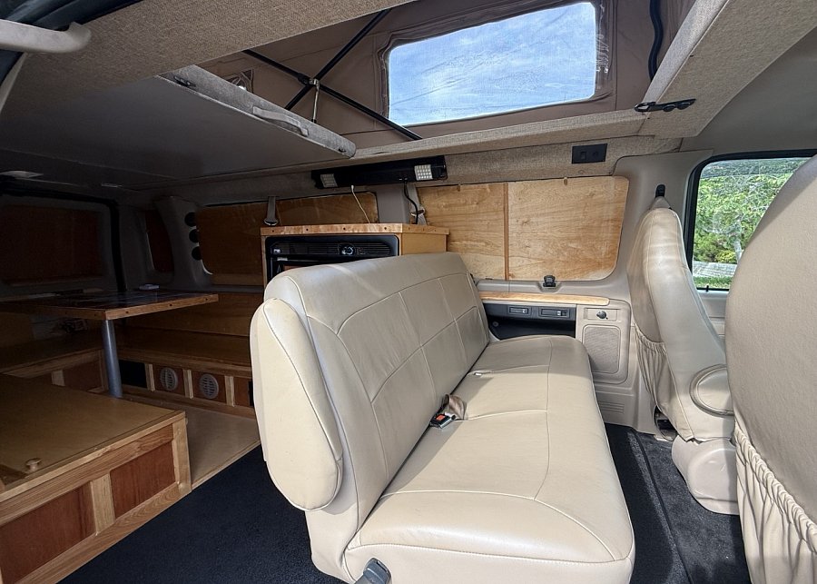 Additional features include running boards, a sportsmobile pop top with an electric opener, a tow hitch for extra versatility, and an aftermarket rear camera with a large display. Modern upgrades such as a new JVC receiver with wireless Bluetooth, new leather-wrapped seats for both front and back, and a factory bench that seats five provide comfort and convenience.