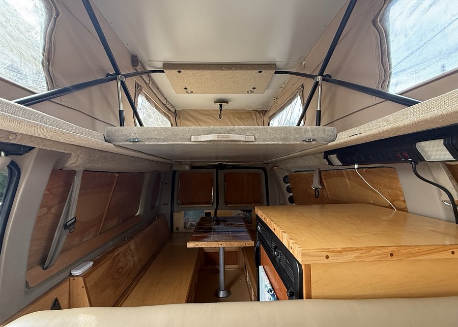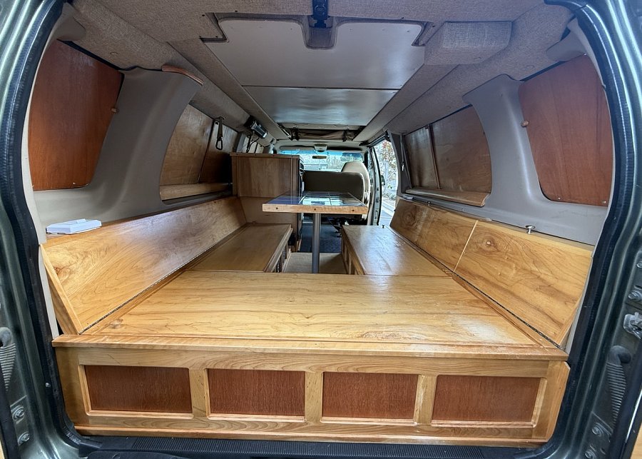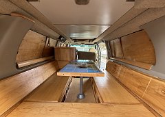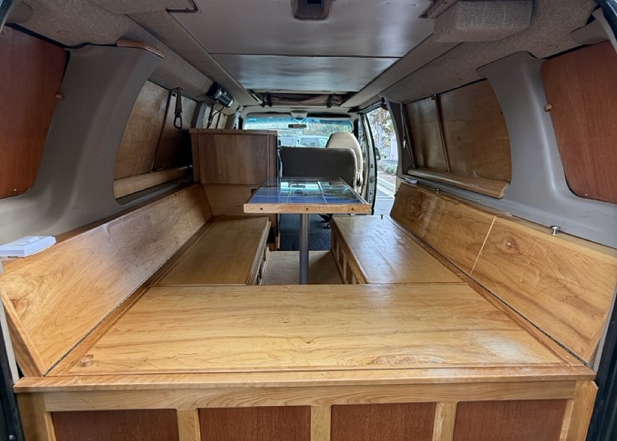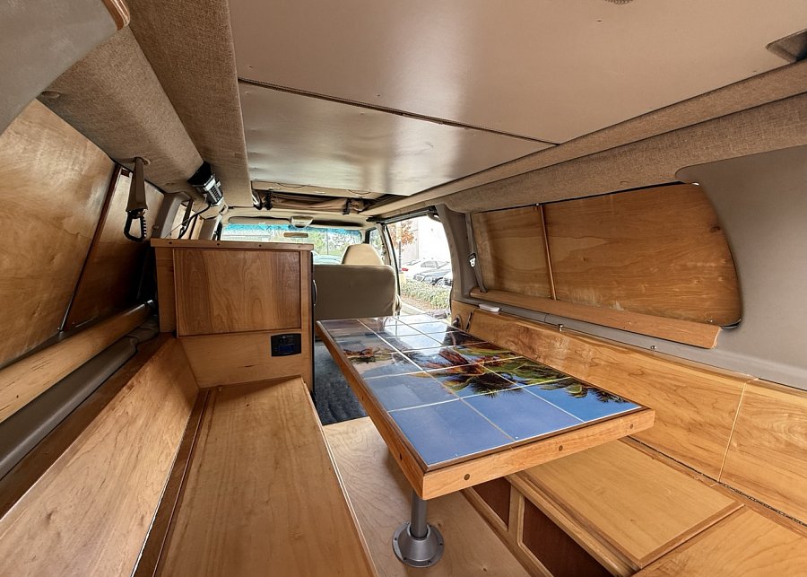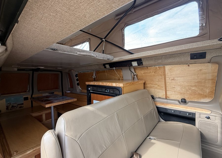 Inside, the custom wood camper interior creates a cozy and functional space for four, with a rear dinette that conveniently converts into a bed for restful nights. The van is equipped with custom off-road tires and rims, with less than 2,000 miles on them, along with Bilstein shocks on both front and rear for a smooth ride.