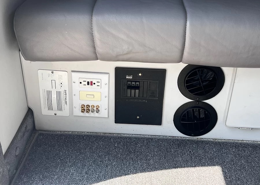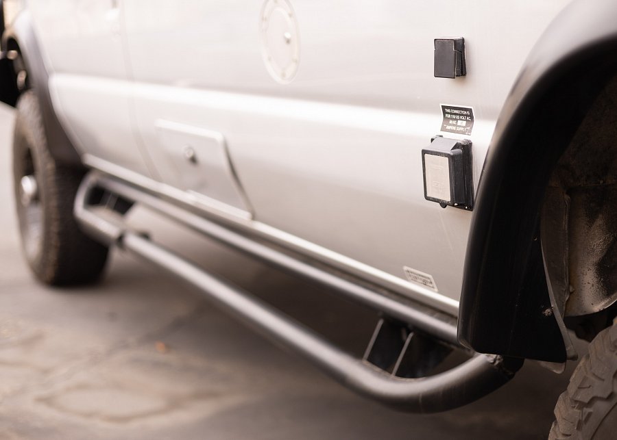 The outside of the van is equipped with all of your off-road needs. The van has a large Road Armor front bumper with winch, awning, onboard compressor, side-steps, side ladder, traction pads, and the rear of the van has a large rear mounted storage box and spare tire carrier with Road Armor bumper. The suspension has been upgraded with custom valved shocks, customer rear springs, Hellwig helper springs, 33” tires (285/75/R16).