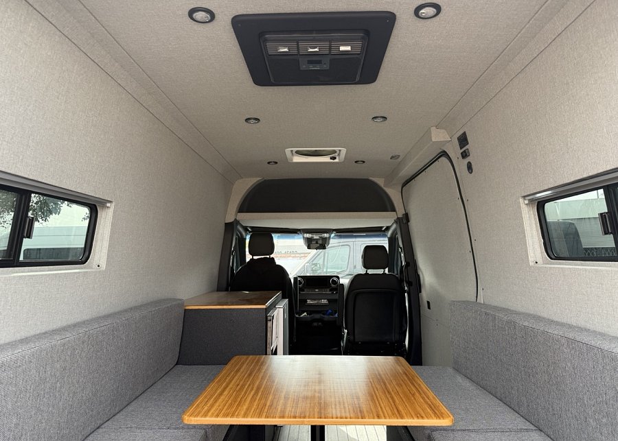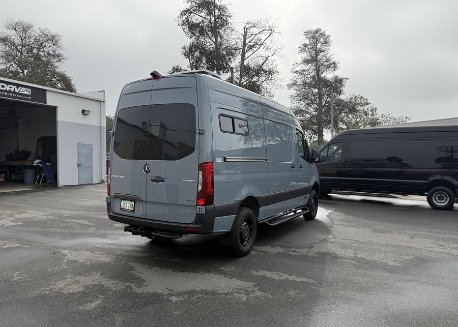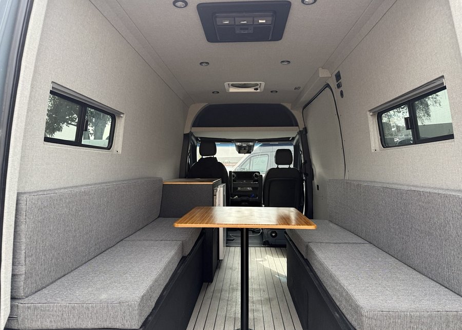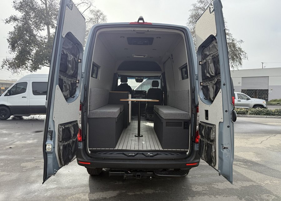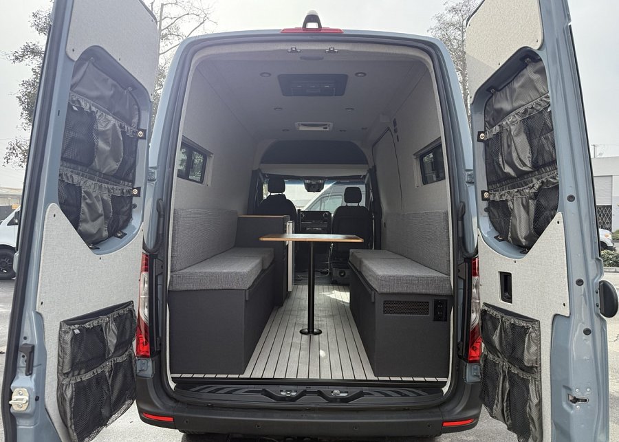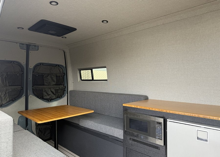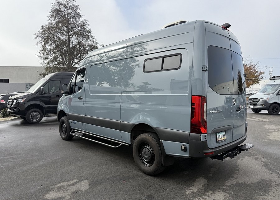 In the rear, a versatile dinette with ample storage converts into a full-size bed, complemented by bunk windows with screens for airflow and natural light. Exterior upgrades include Aluminess side steps, a custom front brush guard, and functional rear door storage. Finished with gray tweed paneling and a clean, modern aesthetic, this Sprinter is a well-balanced, high-quality build ideal for weekend escapes or long-term travel.