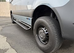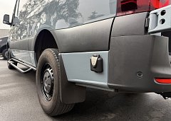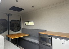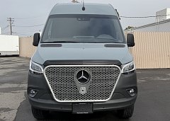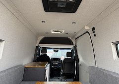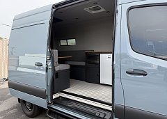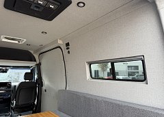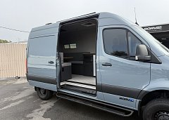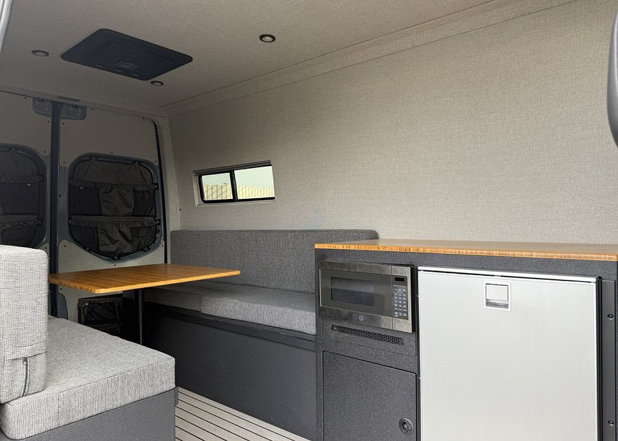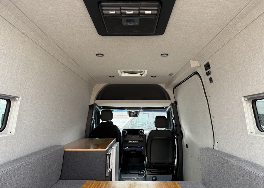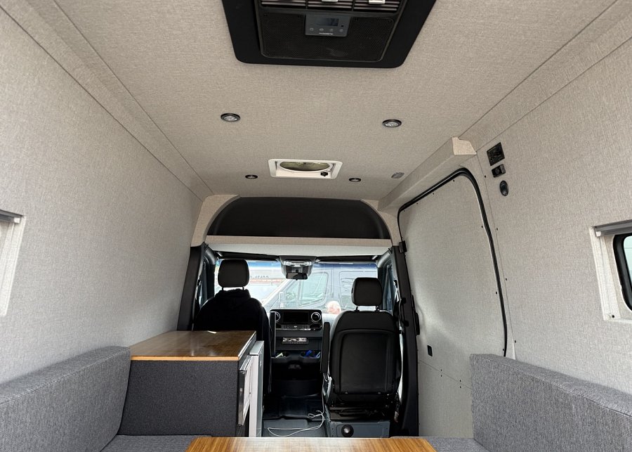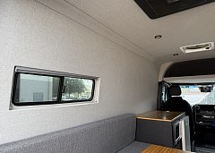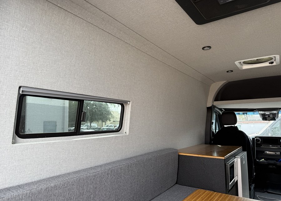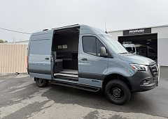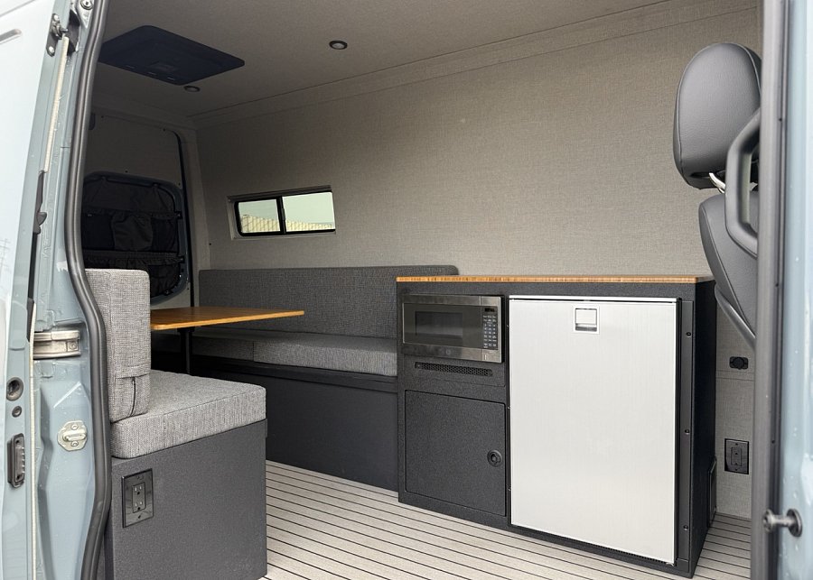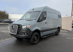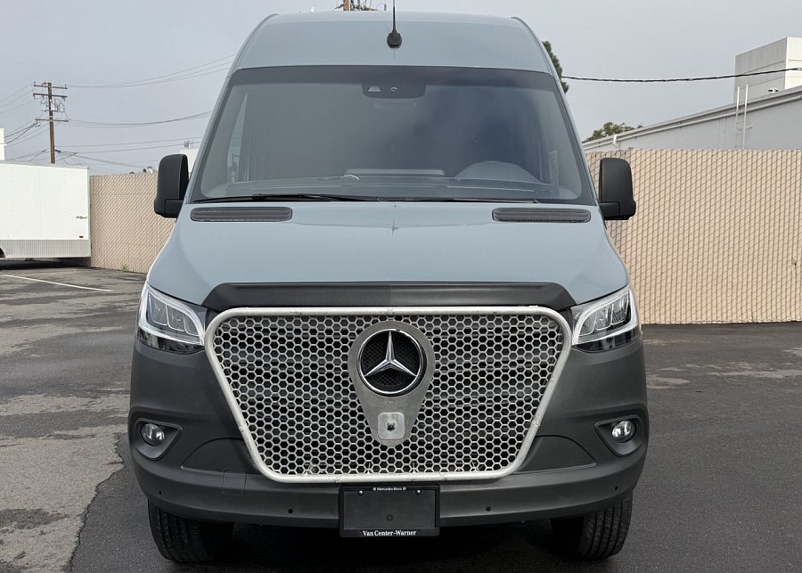 In the rear, a versatile dinette with ample storage converts into a full-size bed, complemented by bunk windows with screens for airflow and natural light. Exterior upgrades include Aluminess side steps, a custom front brush guard, and functional rear door storage. Finished with gray tweed paneling and a clean, modern aesthetic, this Sprinter is a well-balanced, high-quality build ideal for weekend escapes or long-term travel.
