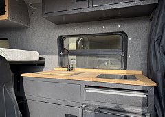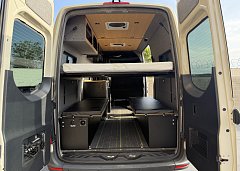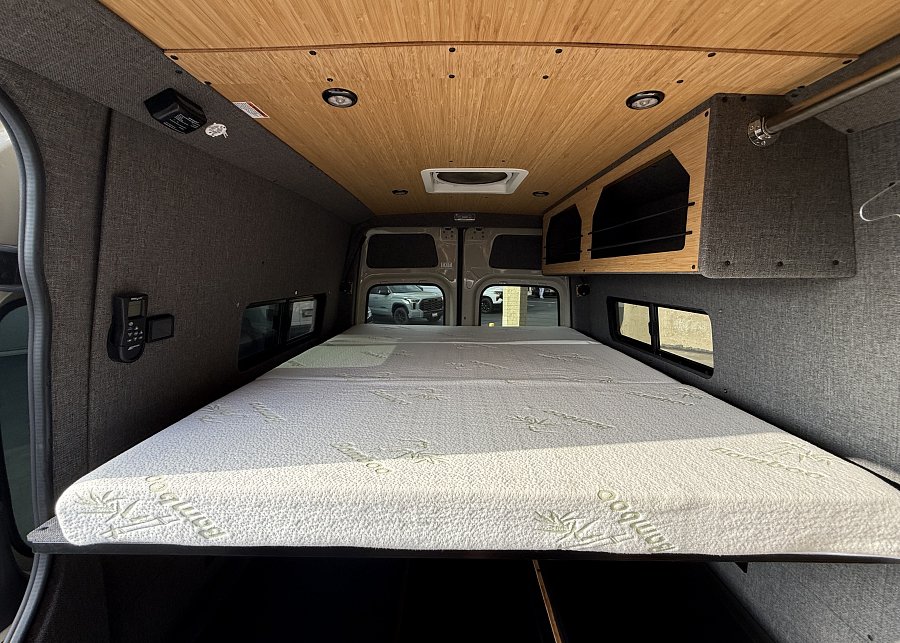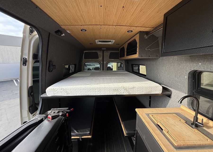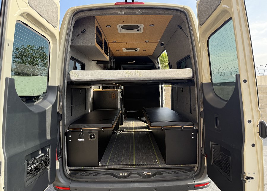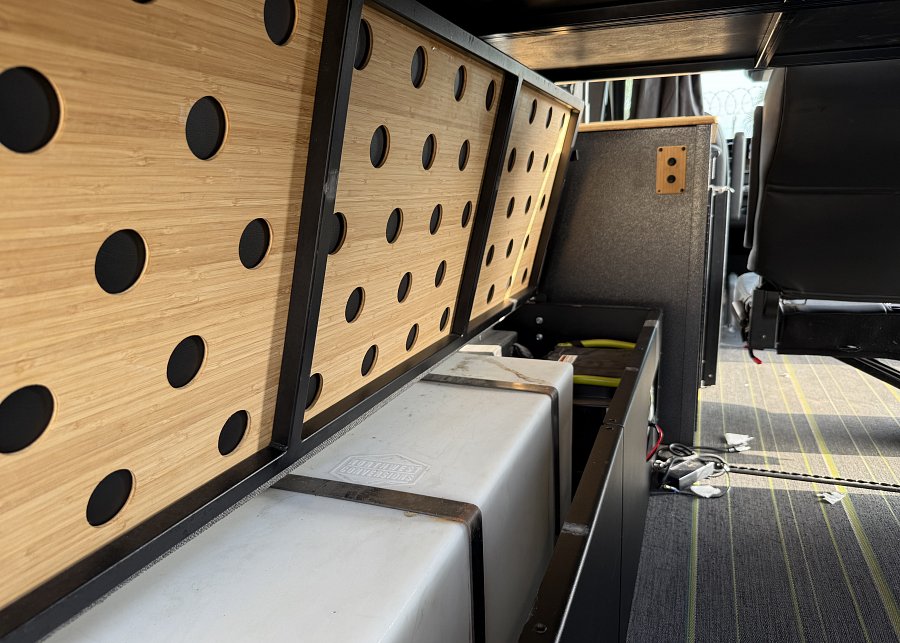 The 260AH of lithium power (Goal Zero 3000x), 3000w inverter, 30 amp shore power, alternator charging, and 100w of solar (expandable) will never leave you stranded without enough power. All of the electronics are tucked away under the rear benches that also houses your 20 gallon fresh water tank. A 20 gallon gray water tank is hidden under the kitchen cabinet. With your water tanks inside, you can take this beautiful rig up to Mammoth or the snow and keep those water lines from freezing.