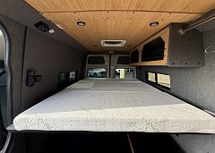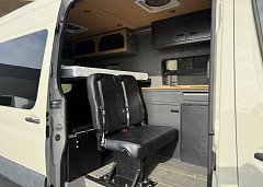 The interior of the van is built to be solo and family friendly. With seating for four, you are able to safely put little ones in the back or pick up friends for a long weekend camping trip. The rear seat flips up out of the way to open up your living space and is safety crash tested. For your long weekend trips, the Novacool fridge will keep everything cool and you have enough prep space to cook a full family dinner. Induction cooktop is powered by your power system and no propane is used in the van, a big plus! Cabinetry is all aluminum so bumpy mountain roads won’t be making any squeaks or rattles.